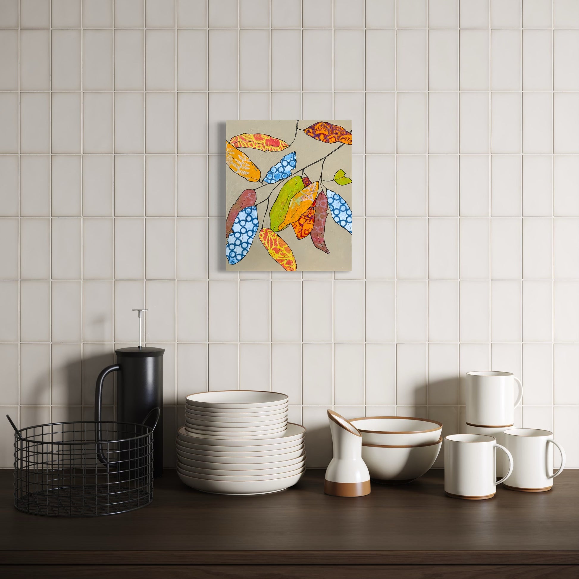 Hand-collaged from hand printed rice papers, every leaf is unique, layered with delicate textures you can almost hear crunching underfoot. Bold black outlines give them a playful, contemporary edge, while the soft taupe background lets the colours sing without overwhelming your space. It’s autumn bottled—vibrant yet peaceful, nostalgic yet fresh.