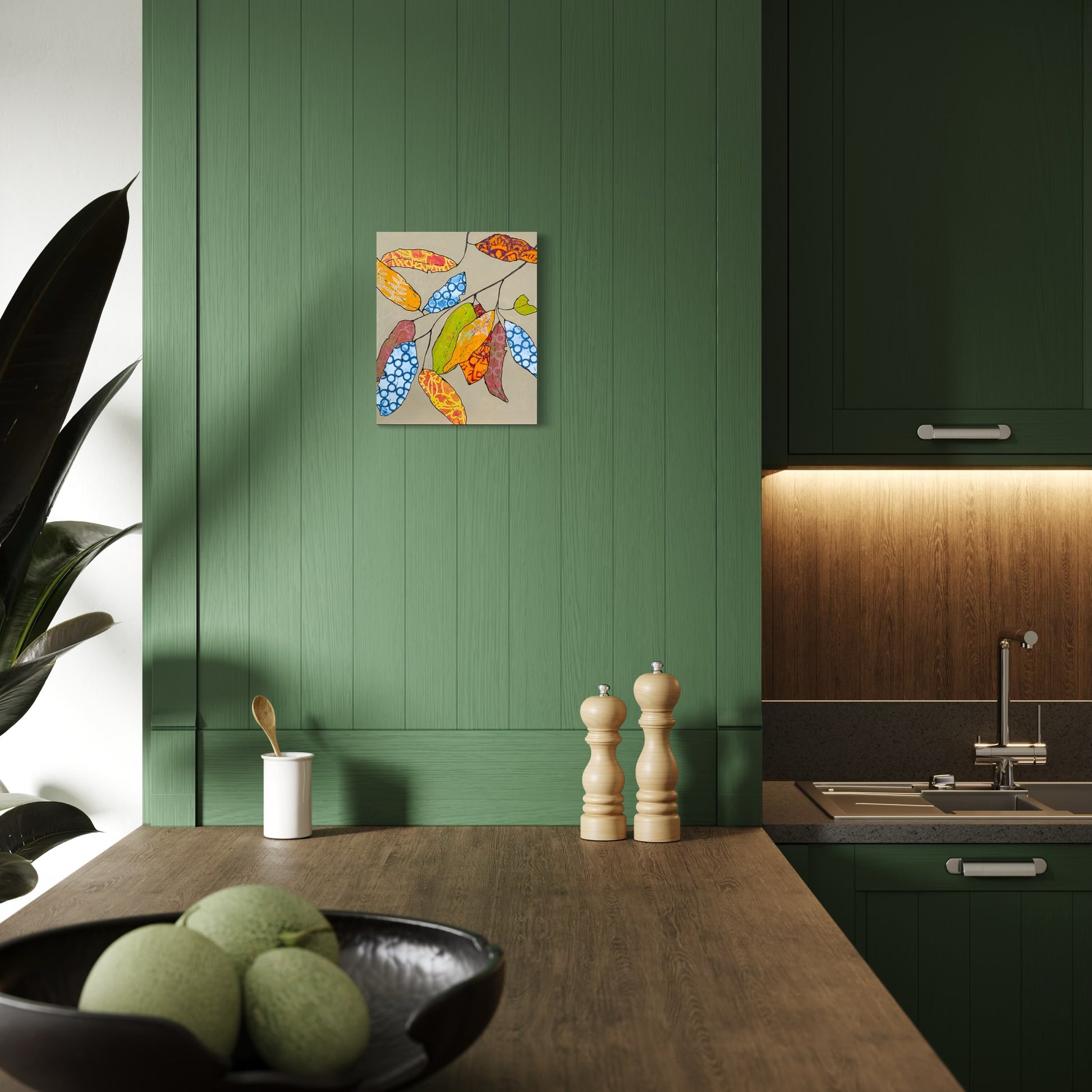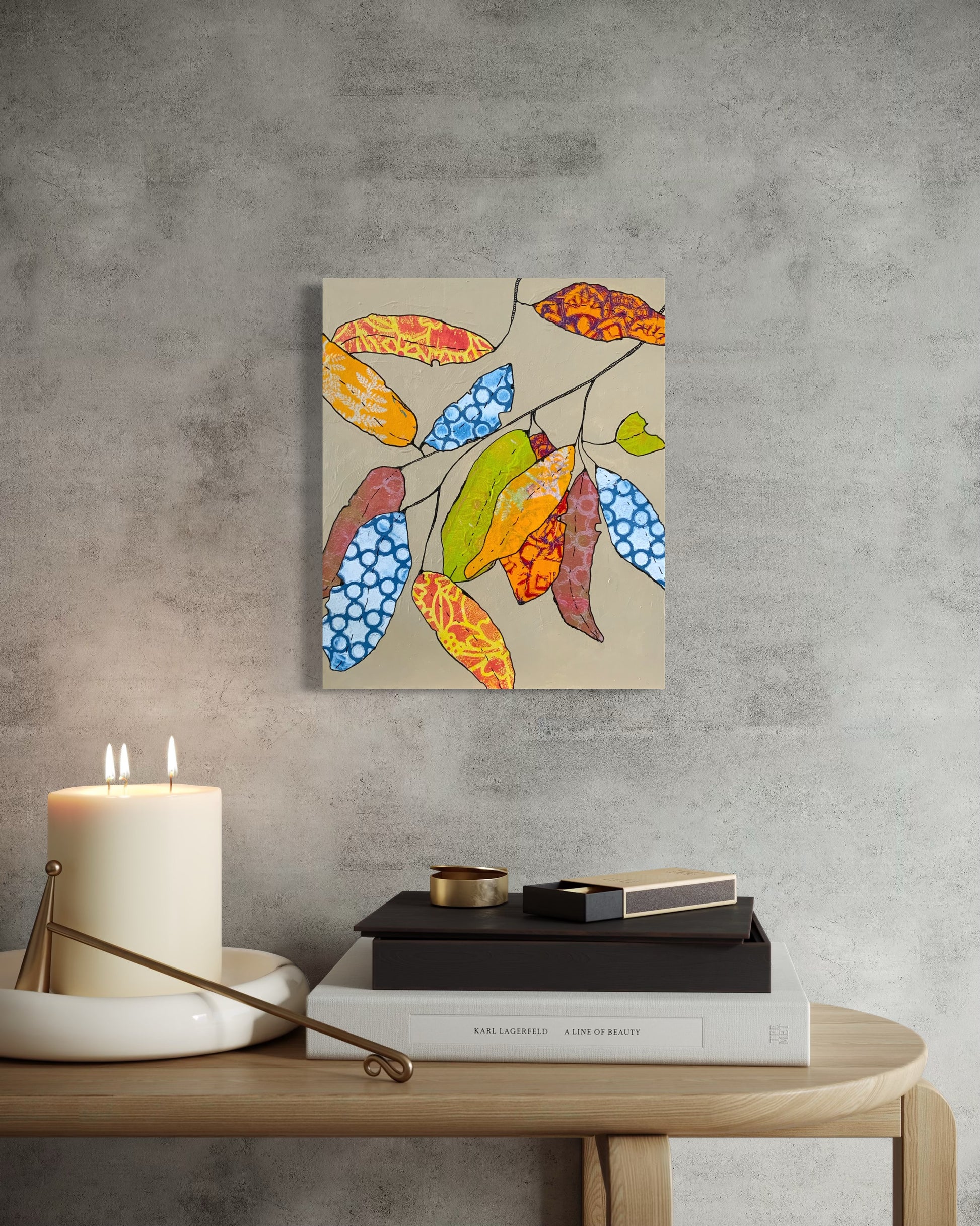 This original mixed-media piece captures that fleeting, magical moment when summer finally lets go and the world explodes into colour one last time. Each leaf is a tiny celebration: fiery oranges that feel like warm hugs, golden yellows that glow like late-afternoon sunshine on your face, deep russets that whisper of cosy evenings by the fire, and unexpected pops of turquoise and indigo—like nature decided to sneak in a little summer sky just to remind you that joy is never far away.