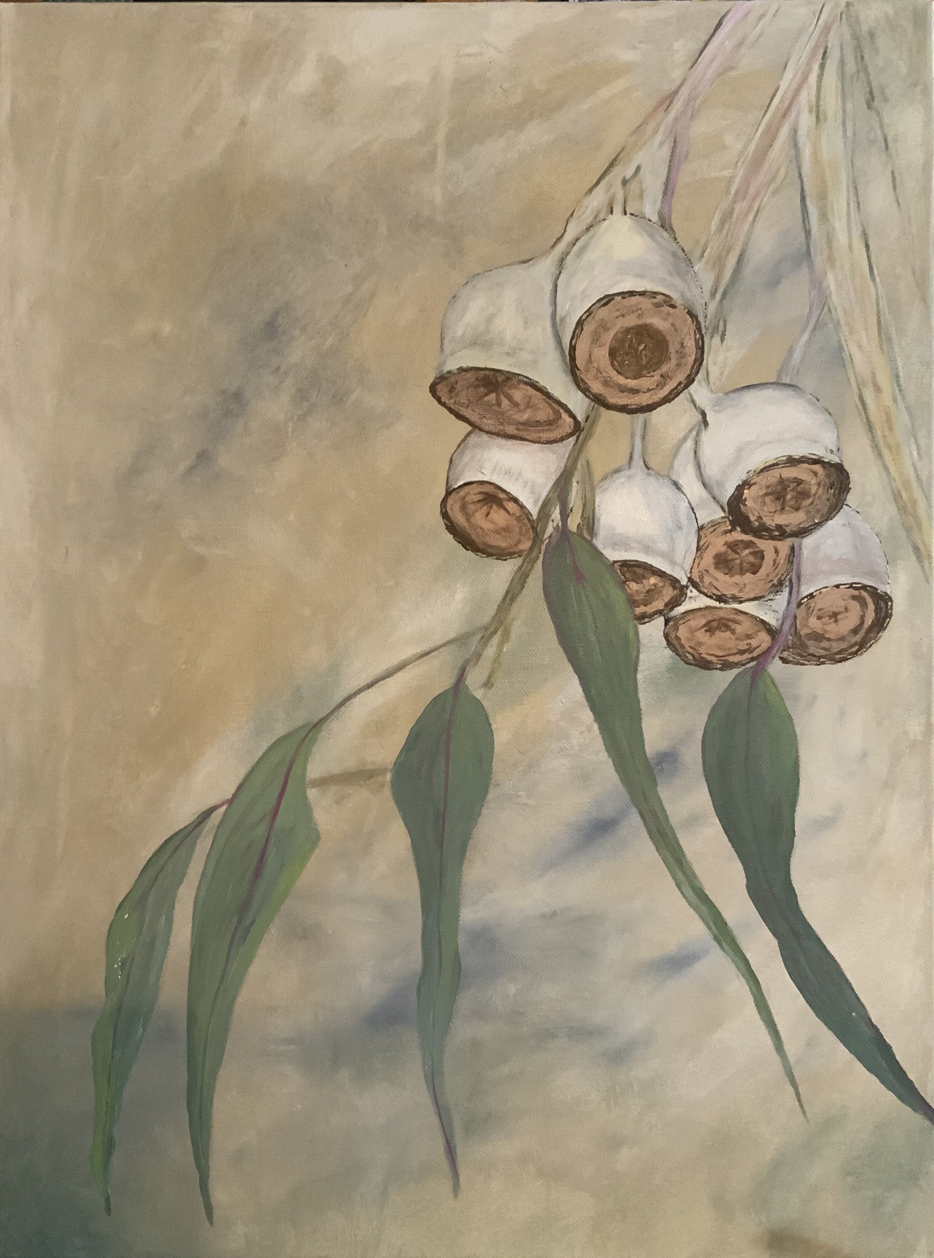 A6 size blank greeting card with envelope showing print of original work "Misty Gumnuts" by Donna Stackman
