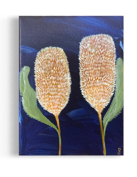 Celebrate the quiet elegance of Australian native flora with this beautifully composed artwork featuring two banksia blooms standing side by side. Each flower is intricately rendered with fine brushstrokes in warm ivory, soft gold and gentle earth tones, capturing the delicate texture of the iconic banksia cones.