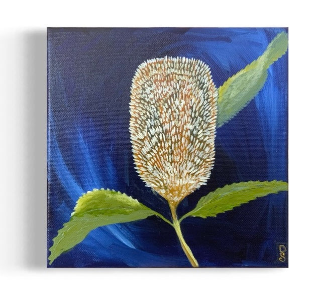 This striking original artwork captures the unique beauty of the Australian banksia flower against a rich, swirling navy blue backdrop. The central bloom is meticulously detailed, showcasing its soft, textured seed cone in hues of warm ochre, ivory and soft browns. It is delicately framed by fresh green serrated leaves, adding a natural balance to the bold, dramatic background.