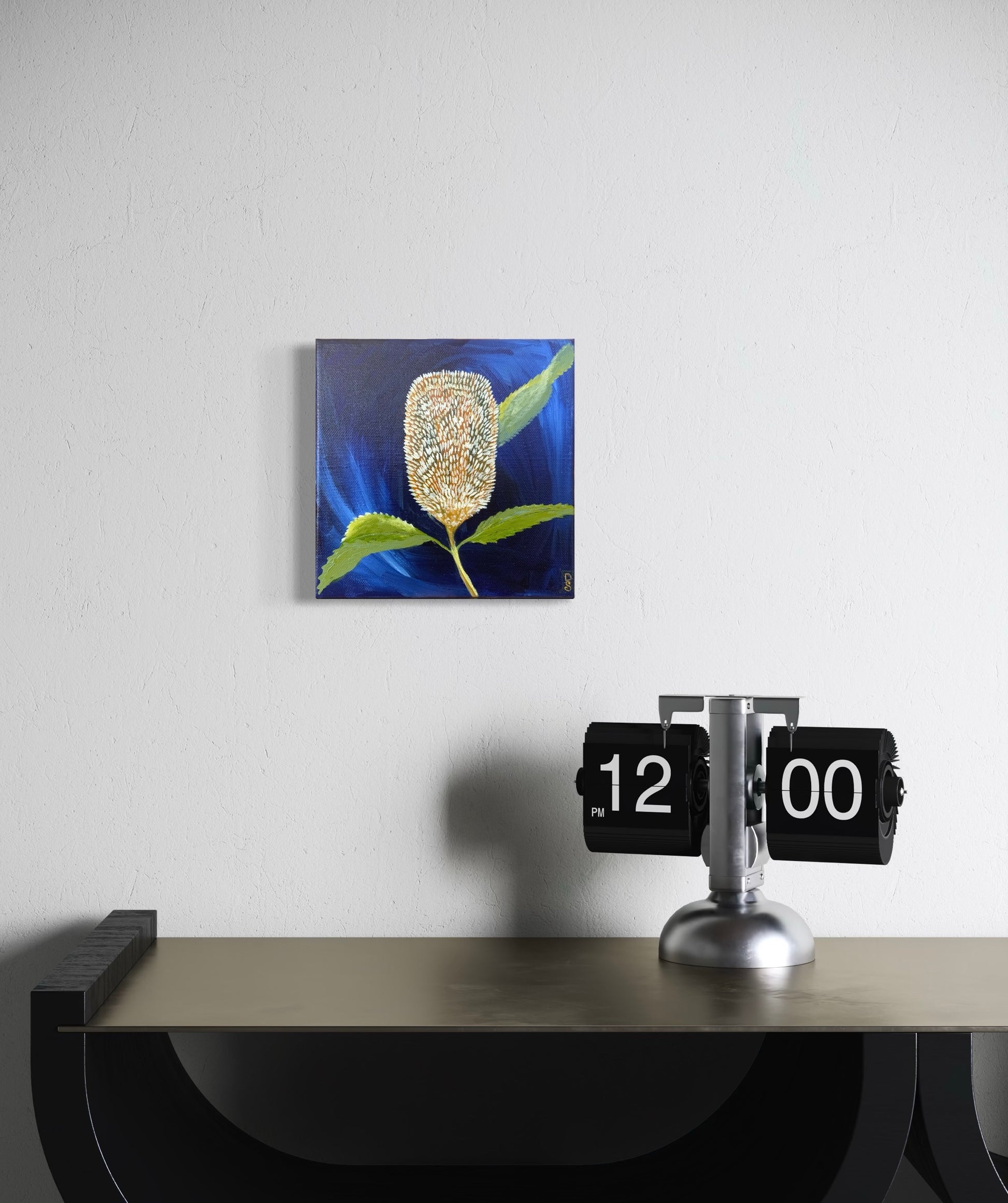 The deep blue tones give the piece a sense of depth and movement, creating a captivating contrast that makes the native botanical subject come alive. The artist’s brushwork highlights both the fragility and resilience of Australian flora, making this a statement piece for lovers of nature-inspired art.