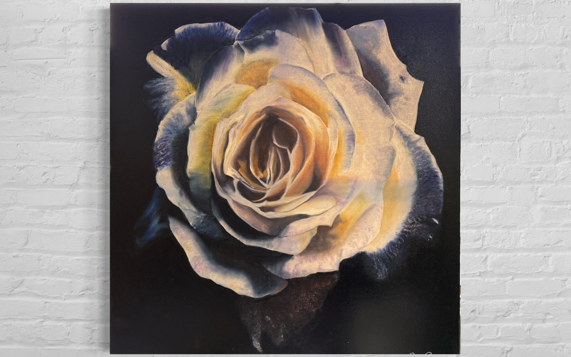 One rose. One midnight canvas. Petals unfurl like the secret you’ve carried since the day love first whispered your name—soft gold at the heart, edged in twilight indigo, fragile yet fearless against the dark. This isn’t art; it’s the exact moment you realized some beauty is worth protecting forever.