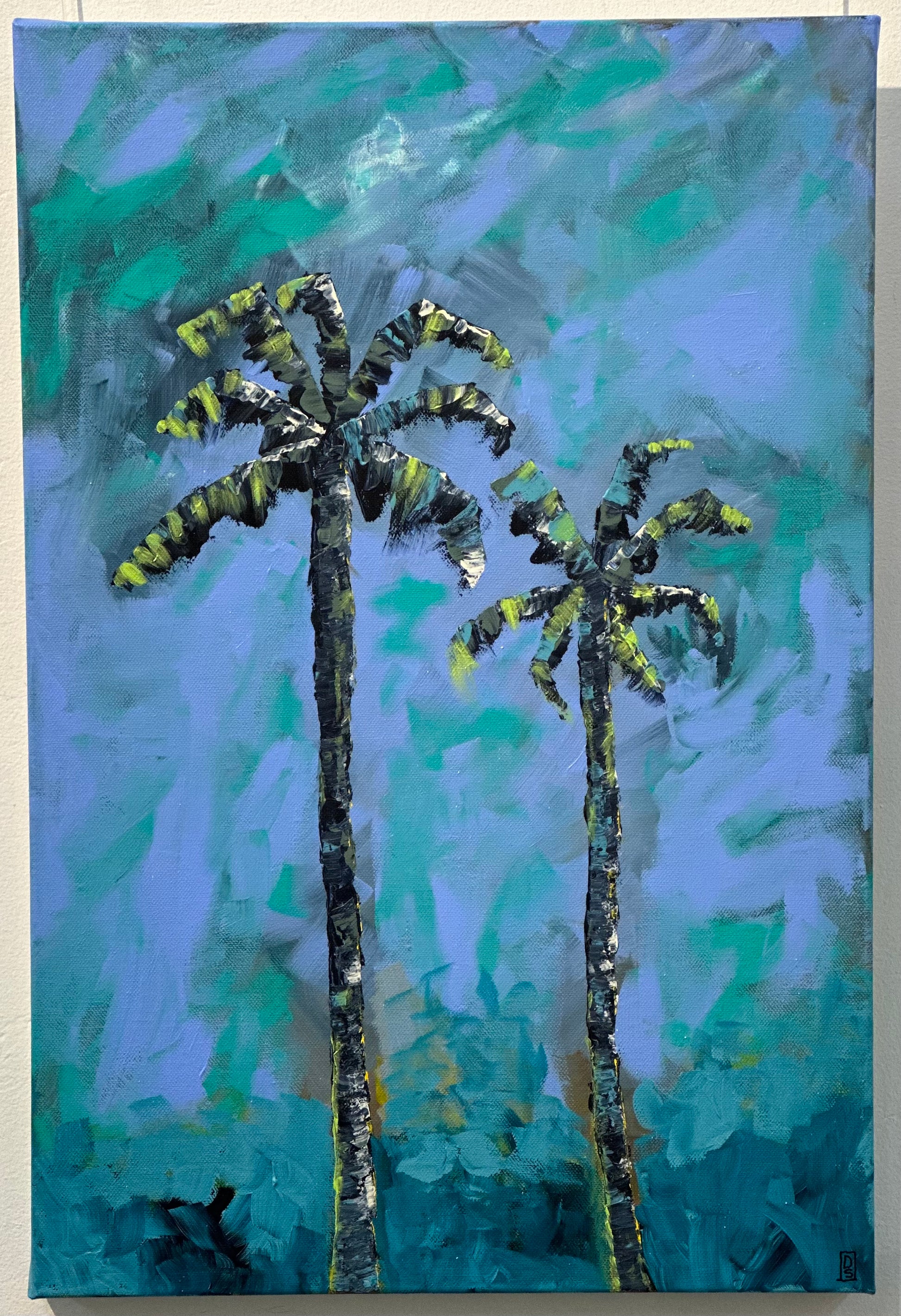 Bring the calm of a coastal evening into your home with Twilight Palms, a contemporary painting that captures the relaxed spirit of seaside life. Two tall palm trees sway gently against a dreamy sky of soft teal, aqua, and dusky lavender tones—evoking that peaceful moment just before night settles in.